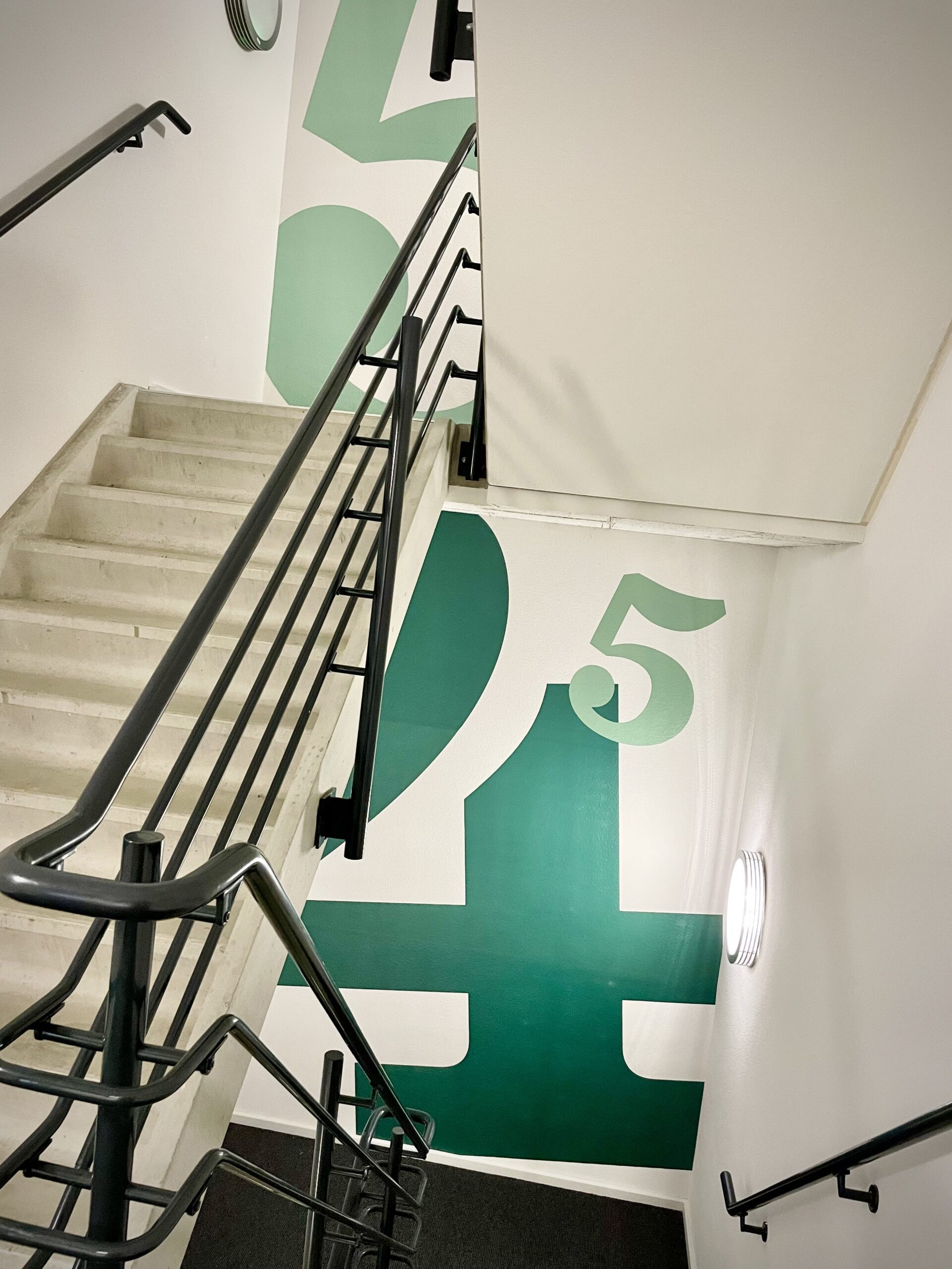 De grafische laag is deels functioneel , deels decoratief. Door de eentonigheid van de verdiepingen en trappenhuizen, is het lastig je in het gebouw te oriënteren. Door verdiepingshoge verdiepingsnummers te plaatsen in trappenhuizen en lifthallen, is het voor de bezoeker duidelijk op welke etage je je bevindt. Elke etage heeft een eigen kleur. Om studenten te inspireren en om het internationale karakter van de opleiding eer aan te doen, hebben wij de gangen voorzien van een quote waarvan het belangrijkste woord is uitgespaard uit het kleurvlak. De metamorfose in non-destructief, relatief goedkoop en snel toe te passen.
